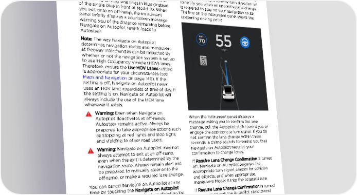 Autosteer lane at an off-ramp. Stay alert and Lane Changes perform visual checks to ensure that the Navigate on Autopilot changes lanes to either driving lane is safe and appropriate. prepare Model X for an upcoming off-ramp, to When you leave a controlled-access road (for increase your driving speed (not to exceed example, you exit a freeway or you enter a your set cruising speed), or to move Model X section of the navigation route that is no out of a left-most lane when you are not longer supported), Navigate on Autopilot passing other vehicles. A message displays at reverts back to Autosteer— a unique triple- the top of the map's turn-by-turn direction list tone chime sounds and the instrument panel to notify you when an upcoming lane change displays the driving lane lines in blue (instead is required to stay on your navigation route. of the single blue in front of Model X). When The line on the instrument panel shows the you exit onto an off-ramp, the instrument upcoming driving path: panel briefly displays a countdown message warning you of the distance remaining before Navigate on Autopilot reverts back to Autosteer. Note: The way Navigate on Autopilot determines navigation routes and maneuvers at freeway interchanges can be impacted by whether or not the navigation system is set up to use High Occupancy Vehicle (HOV) lanes. Therefore, ensure the Use HOV Lanes setting is appropriate for your circumstances (see Maps and Navigation on page 146). If the setting is off, Navigate on Autopilot never uses an HOV lane, regardless of time of day. If the setting is on, Navigate on Autopilot will always include the use of the HOV lane, whenever it exists. Warning: Even when Navigate on When the instrument panel displays a Autopilot deactivates at off-ramps, message asking you to confirm the lane Autosteer remains active. Always be change, pull the Autopilot stalk toward you or prepared to take appropriate actions such engage the appropriate turn signal. If you do as stopping at red lights and stop signs, not confirm the lane change within three and yielding to other road users. seconds, a chime sounds to remind you that Warning: Navigate on Autopilot may not Navigate on Autopilot requires your always attempt to exit at an off-ramp, confirmation to change lanes. even when the exit is determined by the If Require Lane Change Confirmation is turned navigation route. Always remain alert and off, Navigate on Autopilot engages the be prepared to manually steer onto the appropriate turn signal, checks for vehicles off-ramp, or make a required lane change. and objects, and when appropriate, You can cancel Navigate on Autopilot at any maneuvers Model X into the adjacent lane. time by touching the Navigate on Autopilot If Require Lane Change Confirmation is turned button on the map‡s turn-by-turn direction list on, you must pull the Autopilot stalk toward (your vehicle reverts back to Autosteer), or by you or engage the appropriate turn signal to canceling Autosteer entirely (see Canceling confirm that you want Navigate on Autopilot Autosteer on page 108). to make the lane change. If you do not confirm the lane change within three seconds, a chime sounds to remind you that Navigate on Autopilot requires your confirmation to change lanes. Note: If you ignore a route-based lane change suggestion (for example, you are driving in the left lane while approaching an off-ramp on the right side of the highway), Navigate on Autopilot will be unable to maneuver onto the Autopilot 111