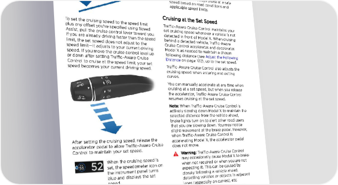Traffic-Aware Cruise Control control lever again to cruise at the new speed limit. You can also manually adjust your cruising speed at any time (see Changing the Set Speed on page 101). Warning: Do not rely on Traffic-Aware Cruise Control or Speed Assist to determine an accurate or appropriate cruising speed. Always cruise at a safe speed based on road conditions and applicable speed limits. Cruising at the Set Speed To set the cruising speed to the speed limit Traffic-Aware Cruise Control maintains your plus any offset you've specified using Speed set cruising speed whenever a vehicle is not Assist, pull the cruise control lever toward you. detected in front of Model X. When cruising If you are already driving faster than the speed behind a detected vehicle, Traffic-Aware limit, the set speed does not adjust to the Cruise Control accelerates and decelerates speed limit—it adjusts to your current driving Model X as needed to maintain a chosen speed. If you move the cruise control level up following distance (see Adjust the Following or down after setting Traffic-Aware Cruise Distance on page 102), up to the set speed. Control to cruise at the speed limit, your set Traffic-Aware Cruise Control also adjusts the speed becomes your current driving speed. cruising speed when entering and exiting curves. You can manually accelerate at any time when cruising at a set speed, but when you release the accelerator, Traffic-Aware Cruise Control resumes cruising at the set speed. Note: When Traffic-Aware Cruise Control is actively slowing down Model X to maintain the selected distance from the vehicle ahead, brake lights turn on to alert other road users that you are slowing down. You may notice slight movement of the brake pedal. However, After setting the cruising speed, release the when Traffic-Aware Cruise Control is accelerator pedal to allow Traffic-Aware Cruise accelerating Model X, the accelerator pedal Control to maintain your set speed. does not move. Warning: Traffic-Aware Cruise Control When the cruising speed is may occasionally cause Model X to brake set, the speedometer icon on when not required or when you are not the instrument panel turns expecting it. This can be caused by blue and displays the set closely following a vehicle ahead, speed. detecting vehicles or objects in adjacent lanes (especially on curves), etc. Note: Double-pulling the cruise control lever Warning: Due to limitations inherent in toward you engages Autosteer (assuming it the onboard GPS (Global Positioning has been enabled as described in Autosteer System), you may experience situations in on page 106). In this case, if you are not which Traffic-Aware Cruise Control slows already cruising at a set speed, the cruising down the vehicle, especially near highway speed is set to either your current driving exits where a curve is detected and/or speed or the speed limit (plus any specified you are actively navigating to a offset), whichever is greater. destination and not following the route. Warning: When you adjust the cruising Warning: Traffic-Aware Cruise Control speed based on the speed limit, the set cannot detect all objects and, especially speed does not change when the speed in situations when you are driving over limit changes. You must pull the cruise 50 mph (80 km/h), may not brake/ 100 Model X Owner's Manual