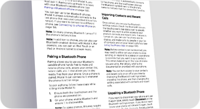 Phone Phone ® 6. Check that the number displayed on your Bluetooth Compatibility phone matches the number displayed on You can use your Bluetooth-capable phone the touchscreen. Then, on your phone, hands-free in Model X provided your phone is confirm that you want to pair. within operating range. Although Bluetooth 7. If prompted on your phone, specify typically supports wireless communication whether you want to allow Model X to over distances of up to approximately 30 feet access your contacts and media files. (9 meters), performance can vary based on the phone you are using. When paired, Model X automatically connects Before using your phone with Model X, you to the phone, and the touchscreen displays must pair it. Pairing sets up Model X to work the Bluetooth symbol next to the phone‡s with your Bluetooth-capable phone (see name to indicate that the connection is active. Pairing a Bluetooth Phone on page 155). You can pair up to ten Bluetooth phones. Importing Contacts and Recent Model X always automatically connects to the Calls last phone that was used (provided it is within Once paired, you can use the Bluetooth range). If you want to connect to a different settings screen (touch the Bluetooth icon on phone, see Connecting to a Paired Phone on the touchscreen's top status bar) to specify page 156. whether you want to allow access to your Note: On many phones, Bluetooth turns off if phone‡s contacts and recent calls. If access is the phone‡s battery is low. turned on, you can use the phone app to Note: In addition to phones, you can also pair display, and make calls to, people in your list Bluetooth-enabled devices with Model X. For of contacts and on your recent calls lists (see example, you can pair an iPod Touch or an Using the Phone App on page 156). iPad or Android tablet to stream music. Note: Before contacts can be imported, you may need to either set your phone to allow Pairing a Bluetooth Phone syncing, or respond to a popup on your phone to confirm that you want to sync contacts. Pairing allows you to use your Bluetooth- This varies depending on the type of phone capable phone hands-free to make and you are using. For details, refer to the receive phone calls, access your contact list, documentation provided with your phone. recent calls, etc. It also allows you to play Note: You can turn access to your contacts media files from your phone. Once a phone is and recent calls on or off at any time by paired, Model X can connect to it whenever displaying the Bluetooth settings screen, the phone is within range. choosing the phone, and then changing the To pair a phone, follow these steps while setting associated with contacts and recent sitting inside Model X: calls. 1. Ensure both the touchscreen and the Unpairing a Bluetooth Phone phone are powered on. 2. On your phone, enable Bluetooth and If you want to disconnect your phone and use ensure it is discoverable. it again later, simply touch Disconnect on the Note: On some phones, this may require Bluetooth settings screen. If you do not want you to go to Bluetooth Settings for the to use your phone with Model X again, touch remainder of the procedure. Forget This Device. Once you forget a device, 3. Touch the Bluetooth icon on the top of the you need to pair it again if you want to use it touchscreen. with Model X (see Pairing a Bluetooth Phone 4. On the touchscreen, touch Add New on page 155). Device > Start Search. The touchscreen Note: Your phone automatically disconnects displays a list of all available Bluetooth whenever you leave Model X. devices within operating distance. 5. On the touchscreen, touch the phone with which you want to pair. Within a few seconds, the touchscreen displays a randomly generated number, and your phone should display the same number. Using the Touchscreen 155