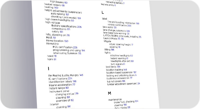Index ground clearance 201 K GVWR 200 Keep Climate On 144 H key FCC and IC certifications 224 hazard warning flashers 61 how to use 6 headlights key not inside 54 adaptive 60 ordering extras 9 after exit 60 replacing battery 7 high beams 60 keyless entry 6 heated wipers 68 heating 140 L height adjustments (suspension) auto-raising 157 label disabling (Jack mode) 159 Tire and Loading Information 199 high beam headlights 60 vehicle certification 200 high voltage lane assist 121 Battery specifications 205 lane change, automatic 108 components 171 lane departure warning 121 safety 181 LATCH/ISOFIX child seats, installing 35 hills, stopping on 76 Launch Mode 77, 78 Hold 70 liftgate Home location 150 adjust opening height 17 HomeLink opening 16 FCC certification 225 lifting 196 programming and using 164 lights when using Summon 115 adaptive headlights 60 hood 18 hazard warning 61 horn 51 headlights after exit 60 turn signals 61 I load limits 199 location tracking 146 I'm Feeling Lucky, Hungry 146 location-based suspension 157 IC certifications 224 locking and unlocking doors 6 identification labels 198 Ludicrous acceleration 77 Insane acceleration 77 lug nut covers 186 instant range 80 lumbar adjustment (premium) 24 instrument panel charging status 179 M cleaning 191 overview of 62 maintenance interior brake fluid, checking 194 cleaning 191 cleaning 190 dimensions 201 daily checks 181 lights 58 fluid replacement intervals 181 overview 2 monthly checks 181 temperature control 140 panel, removing 194 internet radio 153 service intervals 181 ISOFIX/LATCH child seats, installing 35 tires 183 washer fluid, topping up 195 J map orientation 146 map updates 151 J1772 172 mats 192 Jack mode 159 media 152 jacking 196 mileage upon delivery 222 mirrors 52 mobile app 170 Index 229