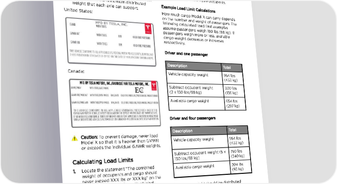 Vehicle Loading Vehicle Certification Label 5. Determine the combined cargo weight being loaded on the vehicle. That weight The Vehicle Certification label provides: must not exceed the available cargo load • GVWR - Gross Vehicle Weight Rating. The capacity calculated in Step 4. maximum allowable total mass of Model X. Warning: Trunks are the preferred places This is calculated as the weight of to carry objects. In a collision, or during Model X, all passengers, fluids, and cargo. hard braking and sharp turns, loose items • GAWR FRT and GAWR RR - Gross Axle in the cabin could injure occupants. Weight Rating for the front and rear axles. The GAWR is the maximum distributed Example Load Limit Calculations weight that each axle can support. How much cargo Model X can carry depends United States: on the number and weight of passengers. The following calculated load limit examples assume passengers weigh 150 lbs (68 kg). If passengers weigh more or less, available cargo weight decreases or increases respectively. Driver and one passenger Description Total Canada: Vehicle capacity weight 954 lbs (433 kg) Subtract occupant weight 300 lbs (2 x 150 lbs/68 kg) (136 kg) Available cargo weight 654 lbs (297 kg) Driver and four passengers Description Total Caution: To prevent damage, never load Model X so that it is heavier than GVWR Vehicle capacity weight 954 lbs or exceeds the individual GAWR weights. (433 kg) Calculating Load Limits Subtract occupant weight (5 x 750 lbs 150 lbs/68 kg) (340 kg) 1. Locate the statement “The combined Available cargo weight 204 lbs weight of occupants and cargo should (93 kg) never exceed XXX lbs or XXX kg” on the “Tire and Loading Information” label. 2. Determine the combined weight of all The cargo weight should be distributed occupants that will ride in the vehicle. between the front and rear trunks. 3. Subtract the combined weight of the Caution: Never load more than 175 lbs (80 occupants from XXX lbs or XXX kg (see kg) on the rear load floor (above the Step 1). lower trunk compartment) or more than 4. The resulting figure equals the available 285 lbs (130 kg) in the lower trunk cargo load capacity. For example, if the compartment. Doing so can cause “XXX” amount equals 1400 lbs (635 kg) damage. and there will be five 150 lb (68 kg) passengers in the vehicle, the amount of available cargo capacity is 650 lbs (1400 ‑ 750 (5 x 150) = 650 lbs) or 295 kg (635 ‑ 340 (5 x 68) = 295 kg). 200 Model X Owner's Manual