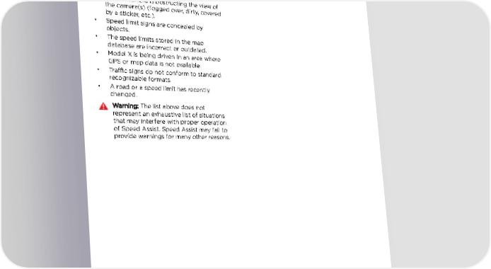Speed Assist • Visibility is poor and speed limit signs are not clearly visible (due to heavy rain, snow, fog, etc.). • Bright light (such as from oncoming headlights or direct sunlight) is interfering with the view of the camera(s). • Model X is being driven very close to a vehicle in front of it which is blocking the view of the camera(s). • The windshield is obstructing the view of the camera(s) (fogged over, dirty, covered by a sticker, etc.). • Speed limit signs are concealed by objects. • The speed limits stored in the map database are incorrect or outdated. • Model X is being driven in an area where GPS or map data is not available. • Traffic signs do not conform to standard recognizable formats. • A road or a speed limit has recently changed. Warning: The list above does not represent an exhaustive list of situations that may interfere with proper operation of Speed Assist. Speed Assist may fail to provide warnings for many other reasons. 128 Model X Owner's Manual