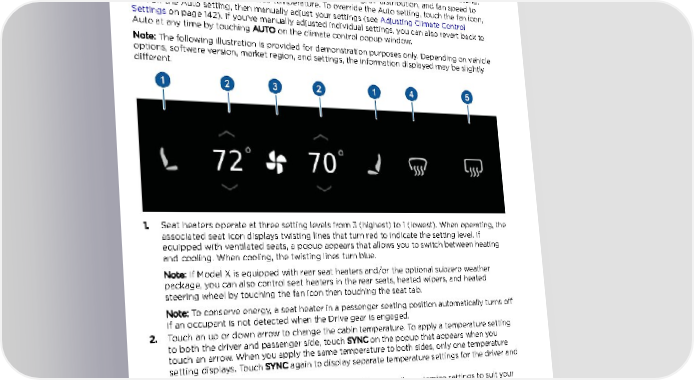Climate Controls Climate Controls Overview of Climate Controls Climate controls are always available at the bottom of the touchscreen. To turn the climate control system on, touch the fan icon or adjust the cabin temperature. To turn it off, touch the fan icon and then touch the off button near the center of the popup window. By default, climate control is set to the Auto setting, which maintains optimum comfort in all but the most severe weather conditions. When you adjust the cabin temperature in the Auto setting, the system automatically adjusts the heating, air conditioning, air distribution, and fan speed to maintain the cabin at your selected temperature. To override the Auto setting, touch the fan icon, turn off the Auto setting, then manually adjust your settings (see Adjusting Climate Control Settings on page 142). If you've manually adjusted individual settings, you can also revert back to Auto at any time by touching AUTO on the climate control popup window. Note: The following illustration is provided for demonstration purposes only. Depending on vehicle options, software version, market region, and settings, the information displayed may be slightly different. 1. Seat heaters operate at three setting levels from 3 (highest) to 1 (lowest). When operating, the associated seat icon displays twisting lines that turn red to indicate the setting level. If equipped with ventilated seats, a popup appears that allows you to switch between heating and cooling. When cooling, the twisting lines turn blue. Note: If Model X is equipped with rear seat heaters and/or the optional subzero weather package, you can also control seat heaters in the rear seats, heated wipers, and heated steering wheel by touching the fan icon then touching the seat tab. Note: To conserve energy, a seat heater in a passenger seating position automatically turns off if an occupant is not detected when the Drive gear is engaged. 2. Touch an up or down arrow to change the cabin temperature. To apply a temperature setting to both the driver and passenger side, touch SYNC on the popup that appears when you touch an arrow. When you apply the same temperature to both sides, only one temperature setting displays. Touch SYNC again to display separate temperature settings for the driver and passenger. 3. Touch the fan icon to turn on climate control and to manually customize settings to suit your preferences (see Adjusting Climate Control Settings on page 142). Touch and hold the fan icon to quickly turn off climate control. If your vehicle is equipped with the optional cold weather package, touch this icon to access controls for the rear seat heaters. 4. The windshield defroster distributes air flow to the windshield. Touch once to defog the windshield (the icon turns blue). Touch a second time to defrost the windshield (the icon turns red and the heating and fan operate at maximum levels). Touch a third time to turn off and restore the air distribution, heating, and fan to their previous settings. 5. Touch to warm up the rear window. When operating, the icon turns red. After 15 minutes, the rear window defroster automatically turns off. The exterior side mirrors are also heated whenever the rear window defroster is operating. 140 Model X Owner's Manual