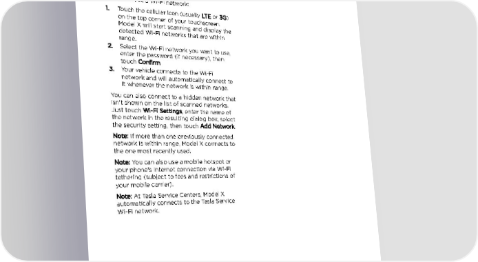 Connecting to Wi-Fi Connecting to Wi-Fi Wi-Fi is available as a data connection method and is often faster than cellular data networks. Connecting to Wi-Fi is especially useful in areas with limited or no cellular connectivity. To ensure fast, reliable delivery of software and map updates, Tesla recommends leaving your vehicle connected to a Wi-Fi network whenever possible (for example, if parked in your garage overnight). To connect to a Wi-Fi network: 1. Touch the cellular icon (usually LTE or 3G) on the top corner of your touchscreen. Model X will start scanning and display the detected Wi-Fi networks that are within range. 2. Select the Wi-Fi network you want to use, enter the password (if necessary), then touch Confirm. 3. Your vehicle connects to the Wi-Fi network and will automatically connect to it whenever the network is within range. You can also connect to a hidden network that isn't shown on the list of scanned networks. Just touch Wi-Fi Settings, enter the name of the network in the resulting dialog box, select the security setting, then touch Add Network. Note: If more than one previously connected network is within range, Model X connects to the one most recently used. Note: You can also use a mobile hotspot or your phone's Internet connection via Wi-Fi tethering (subject to fees and restrictions of your mobile carrier). Note: At Tesla Service Centers, Model X automatically connects to the Tesla Service Wi-Fi network. Using the Touchscreen 167