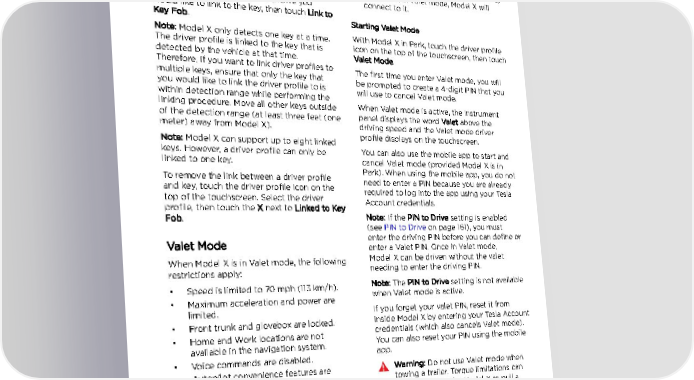 Driver Profiles Linking a Driver Profile to a Key • Wi-Fi and Bluetooth are disabled. When Model X is in Valet mode, you cannot pair You can link a driver profile to a specific key to new Bluetooth devices or view or delete allow Model X to automatically select the existing paired devices. correct driver profile when the linked key is Note: If a Bluetooth paired device or a detected as you approach the vehicle and known Wi-Fi network is within operating open the driver's door. To link a driver profile range (approximately 30 feet or 9 meters) to a key, enter Model X with the key and touch of Model X in Valet mode, Model X will the driver profile icon on the top of the connect to it. touchscreen. Select the driver profile you would like to link to the key, then touch Link to Key Fob. Starting Valet Mode Note: Model X only detects one key at a time. With Model X in Park, touch the driver profile The driver profile is linked to the key that is icon on the top of the touchscreen, then touch detected by the vehicle at that time. Valet Mode. Therefore, if you want to link driver profiles to The first time you enter Valet mode, you will multiple keys, ensure that only the key that be prompted to create a 4-digit PIN that you you would like to link the driver profile to is will use to cancel Valet mode. within detection range while performing the linking procedure. Move all other keys outside When Valet mode is active, the instrument of the detection range (at least three feet (one panel displays the word Valet above the meter) away from Model X). driving speed and the Valet mode driver Note: Model X can support up to eight linked profile displays on the touchscreen. keys. However, a driver profile can only be You can also use the mobile app to start and linked to one key. cancel Valet mode (provided Model X is in To remove the link between a driver profile Park). When using the mobile app, you do not and key, touch the driver profile icon on the need to enter a PIN because you are already top of the touchscreen. Select the driver required to log into the app using your Tesla profile, then touch the X next to Linked to Key Account credentials. Fob. Note: If the PIN to Drive setting is enabled (see PIN to Drive on page 161), you must Valet Mode enter the driving PIN before you can define or enter a Valet PIN. Once in Valet mode, When Model X is in Valet mode, the following Model X can be driven without the valet restrictions apply: needing to enter the driving PIN. • Speed is limited to 70 mph (113 km/h). Note: The PIN to Drive setting is not available • Maximum acceleration and power are when Valet mode is active. limited. If you forget your valet PIN, reset it from • Front trunk and glovebox are locked. inside Model X by entering your Tesla Account • Home and Work locations are not credentials (which also cancels Valet mode). available in the navigation system. You can also reset your PIN using the mobile • Voice commands are disabled. app. • Autopilot convenience features are Warning: Do not use Valet mode when disabled. towing a trailer. Torque limitations can • Most status bar functions are disabled. make it difficult for Model X to pull a • The Mobile Access setting is disabled. trailer up a hill. • HomeLink (if applicable in your market Canceling Valet Mode region) is not accessible. • Driver Profiles are not accessible. With Model X in Park, touch the Valet Mode driver icon on the touchscreen's status bar, then enter your 4-digit PIN. When you cancel Valet mode, all settings associated with the most recently used driver profile and climate control settings are restored, and all features are available. Driving 47