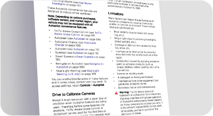 About Autopilot Features Note: If you attempt to use a feature that is not available until the calibration process is These safety features are available on all complete, the feature will not be enabled and Model X vehicles: the instrument panel displays a message. • Lane Assist (see Lane Assist on page 121). Note: Model X must repeat the calibration • Collision Avoidance Assist (see Collision process if the cameras are serviced by Tesla, Avoidance Assist on page 124). and in some cases, after a software update. • Speed Assist (see Speed Assist on page Note: The self-calibration drive process is only 127). applicable to Model X vehicles built after • Auto High Beam (see High Beam approximately October 12, 2016. Headlights on page 60). These Autopilot convenience features are Limitations designed to reduce driver workload: Note: Depending on options purchased, Many factors can impact the performance of software version, and market region, your Autopilot components, causing them to be vehicle may not be equipped with all unable to function as intended. These include Autopilot convenience features. (but are not limited to): • Traffic-Aware Cruise Control (see Traffic- • Poor visibility (due to heavy rain, snow, Aware Cruise Control on page 99) fog, etc.). • Autosteer (see Autosteer on page 106) • Bright light (due to oncoming headlights, direct sunlight, etc.). • Auto Lane Change (see Auto Lane • Damage or obstructions caused by mud, Change on page 108) ice, snow, etc. • Autopark (see Autopark on page 113) • Interference or obstruction by object(s) • Summon (see Summon on page 115) mounted onto the vehicle (such as a bike • Smart Summon (Smart Summon on page rack). 118) • Obstruction caused by applying excessive • Navigate on Autopilot (see Navigate on paint or adhesive products (such as Autopilot on page 109) wraps, stickers, rubber coating, etc.) onto • Stop Light Warning (see Stop Light the vehicle. Warning (U.S. only) on page 109 • Narrow or winding roads. You can enable/disable some of these features • A damaged or misaligned bumper. and in some cases, control how they work. To • Interference from other equipment that access settings, touch Controls > Autopilot. generates ultrasonic waves. • Extremely hot or cold temperatures. Drive to Calibrate Cameras Warning: The list above does not Model X must maneuver with a great deal of represent an exhaustive list of situations precision when Autopilot features are being that may interfere with proper operation used. Therefore, before some features (for of Autopilot components. Never depend example, Traffic-Aware Cruise Control or on these components to keep you safe. It Autosteer) can be used for the first time or is the driver's responsibility to stay alert, after certain Service repairs, the cameras must drive safely, and be in control of the complete a self-calibration process. For your vehicle at all times. convenience, a progress indicator is displayed Caution: If a windshield replacement is on the instrument panel. needed, take your vehicle to Tesla Service. Calibration typically completes after driving This will ensure appropriate handling and 20-25 miles (32-40 km), but the distance mounting of the camera(s). Failure to do varies depending on road and environmental so can cause one or more Autopilot conditions. Driving on a straight road with features to malfunction. highly-visible lane lines allows Model X to calibrate quicker. When calibration is complete, the Autopilot features are available for use. Contact Tesla only if your Model X has not completed the calibration process after driving 100 miles (160 km). Autopilot 97