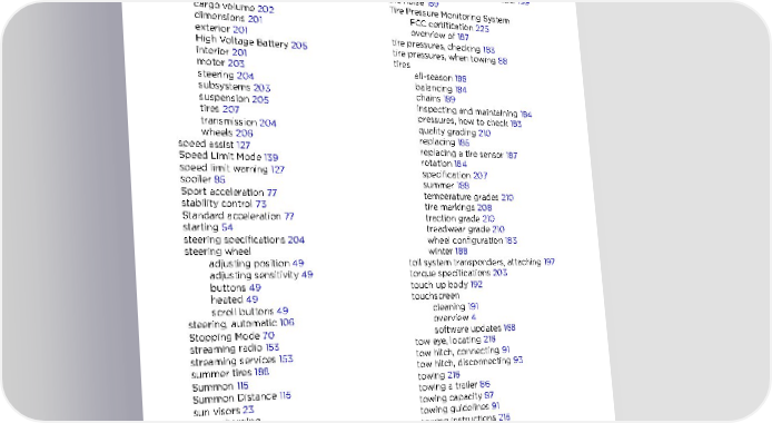 Index SiriusXM 152 temperature (continued) slip start 73 heated steering wheel 51 Smart Summon 118 outside 62 software reset 139 tires 210 software update preferences 168 Teslacam 83 software updates 168 third row seats, folding and raising 28 software version 5 tie-down straps 217 specifications Tire and Loading Information label 199 12V battery 205 tire noise 189 brakes 204 Tire Pressure Monitoring System cargo volume 202 FCC certification 225 dimensions 201 overview of 187 exterior 201 tire pressures, checking 183 High Voltage Battery 205 tire pressures, when towing 88 interior 201 tires motor 203 all-season 188 steering 204 balancing 184 subsystems 203 chains 189 suspension 205 inspecting and maintaining 184 tires 207 pressures, how to check 183 transmission 204 quality grading 210 wheels 206 replacing 185 speed assist 127 replacing a tire sensor 187 Speed Limit Mode 139 rotation 184 speed limit warning 127 specification 207 spoiler 85 summer 188 Sport acceleration 77 temperature grades 210 stability control 73 tire markings 208 Standard acceleration 77 traction grade 210 starting 54 treadwear grade 210 steering specifications 204 wheel configuration 183 steering wheel winter 188 adjusting position 49 toll system transponders, attaching 197 adjusting sensitivity 49 torque specifications 203 buttons 49 touch up body 192 heated 49 touchscreen scroll buttons 49 cleaning 191 steering, automatic 106 overview 4 Stopping Mode 70 software updates 168 streaming radio 153 tow eye, locating 216 streaming services 153 tow hitch, connecting 91 summer tires 188 tow hitch, disconnecting 93 Summon 115 towing 216 Summon Distance 115 towing a trailer 86 sun visors 23 towing capacity 87 supercharging towing guidelines 91 described 180 towing instructions 215 idle fees 180 Towing Label 199 pay-per-use fees 180 TPMS suspension (air), settings for 157 FCC certification 225 suspension specifications 205 overview of 187 Tracking Disabled 146 traction control 73 T trademarks 220 Traffic-Aware Cruise Control 99 telematics 221 Trailer Brakes for towing 89 temperature Trailer Mode 89 Battery (high voltage), limits 173 trailer, towing 86 cabin, controls for 140 transmission specifications 204 transponders, attaching 197 Index 231