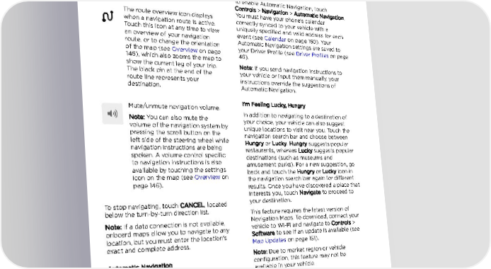 Maps and Navigation If Navigate on Autopilot is enabled, you can In addition, if you are Home and get in your turn it on for the navigation route by touching vehicle on weekdays (Monday-Friday) from Navigate on Autopilot in the turn-by-turn 5AM-11AM, Model X will automatically route direction list. Navigate on Autopilot is an you to your predetermined Work destination extension of Autosteer that automatically (see Recent, Favorite, Home and Work changes lanes and steers Model X onto the Destinations on page 150). If you are at work appropriate exit(s) when navigating on on weekdays from 3PM-11PM, your vehicle will controlled access roads (such as freeways). automatically route you Home. For details, see Navigate on Autopilot on page To enable Automatic Navigation, touch 109. Controls > Navigation > Automatic Navigation. The route overview icon displays You must have your phone's calendar when a navigation route is active. correctly synced to your vehicle with a Touch this icon at any time to view uniquely specified and valid address for each an overview of your navigation event (see Calendar on page 160). Your route, or to change the orientation Automatic Navigation settings are saved to of the map (see Overview on page your Driver Profile (see Driver Profiles on page 146), which also zooms the map to 46). show the current leg of your trip. Note: If you send navigation instructions to The black pin at the end of the your vehicle or input them manually, your route line represents your instructions override the suggestions of destination. Automatic Navigation. Mute/unmute navigation volume. I'm Feeling Lucky, Hungry Note: You can also mute the In addition to navigating to a destination of volume of the navigation system by your choice, your vehicle can also suggest pressing the scroll button on the unique locations to visit near you. Touch the left side of the steering wheel while navigation search bar and choose between navigation instructions are being Hungry or Lucky. Hungry suggests popular spoken. A volume control specific restaurants, whereas Lucky suggests popular to navigation instructions is also destinations (such as museums and available by touching the settings amusement parks). For a new suggestion, go icon on the map (see Overview on back and touch the Hungry or Lucky icon in page 146). the navigation search bar again for different results. Once you have discovered a place that interests you, touch Navigate to proceed to To stop navigating, touch CANCEL, located your destination. below the turn-by-turn direction list. This feature requires the latest version of Note: If a data connection is not available, Navigation Maps. To download, connect your onboard maps allow you to navigate to any vehicle to Wi-Fi and navigate to Controls > location, but you must enter the location's Software to see if an update is available (see exact and complete address. Map Updates on page 151). Note: Due to market region or vehicle Automatic Navigation configuration, this feature may not be Model X uses Automatic Navigation to route available in your vehicle. you to a predicted destination when you get in your vehicle. If you have an upcoming event shown in a phone's calendar that has been synced to Model X, your vehicle will automatically suggest the location of the event (if it has a valid address) when you are preparing to drive within two hours of the event start time. 148 Model X Owner's Manual
