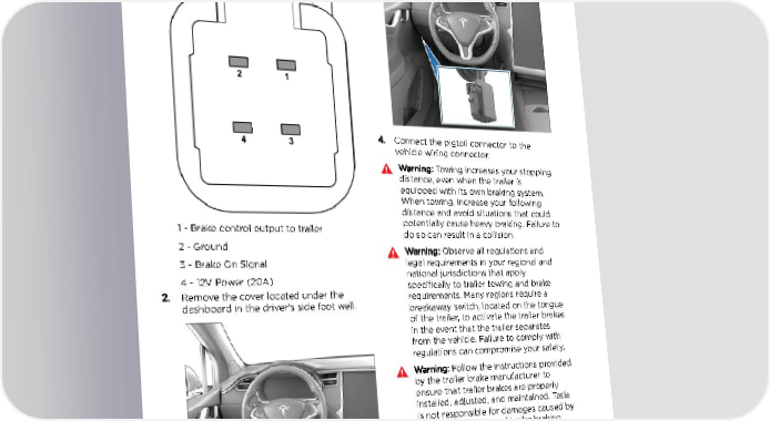 Towing and Accessories 1. Connect the wiring on the brake controller 3. Peel back the carpet to expose Model X's to the appropriate locations on the 4-pin 4-pin connector on the wiring harness. pigtail connector included with your Model X. 4. Connect the pigtail connector to the vehicle wiring connector. Warning: Towing increases your stopping distance, even when the trailer is equipped with its own braking system. When towing, increase your following distance and avoid situations that could 1 - Brake control output to trailer potentially cause heavy braking. Failure to do so can result in a collision. 2 - Ground Warning: Observe all regulations and 3 - Brake On Signal legal requirements in your regional and 4 - 12V Power (20A) national jurisdictions that apply 2. Remove the cover located under the specifically to trailer towing and brake dashboard in the driver's side foot well. requirements. Many regions require a breakaway switch, located on the tongue of the trailer, to activate the trailer brakes in the event that the trailer separates from the vehicle. Failure to comply with regulations can compromise your safety. Warning: Follow the instructions provided by the trailer brake manufacturer to ensure that trailer brakes are properly installed, adjusted, and maintained. Tesla is not responsible for damages caused by incorrect installation of trailer braking systems. Warning: Never attempt to connect trailer brakes directly to the vehicle braking system. Doing so can cause damage to the vehicle and the trailer, and can cause the braking system to malfunction, resulting in serious injury or death. 90 Model X Owner's Manual