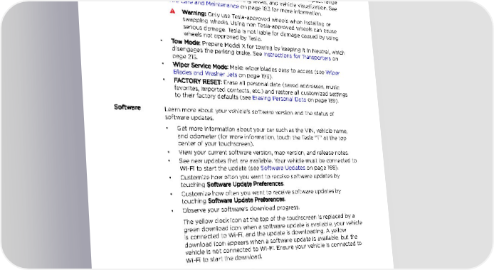 Controls Service • Spoiler Mode: If equipped, the spoiler can change position to provide maximum visibility and the most effective aerodynamics for Model X. To enable, choose Automatic (see Active Spoiler on page 85). • Wheel Configuration: Update your vehicle's wheel configuration if you are installing new wheels or swapping them for different ones. This also changes the wheels of your vehicle's avatar on the touchscreen. Note: Changing your vehicle's wheel configuration can impact range estimates, tire pressure warning levels, and vehicle visualization. See Tire Care and Maintenance on page 183 for more information. Warning: Only use Tesla-approved wheels when installing or swapping wheels. Using non Tesla-approved wheels can cause serious damage. Tesla is not liable for damage caused by using wheels not approved by Tesla. • Tow Mode: Prepare Model X for towing by keeping it in Neutral, which disengages the parking brake. See Instructions for Transporters on page 215. • Wiper Service Mode: Make wiper blades easy to access (see Wiper Blades and Washer Jets on page 193). • FACTORY RESET: Erase all personal data (saved addresses, music favorites, imported contacts, etc.) and restore all customized settings to their factory defaults (see Erasing Personal Data on page 139). Software Learn more about your vehicle's software version and the status of software updates. • Get more information about your car such as the VIN, vehicle name, and odometer (for more information, touch the Tesla "T" at the top center of your touchscreen). • View your current software version, map version, and release notes. • See new updates that are available. Your vehicle must be connected to Wi-Fi to start the update (see Software Updates on page 168). • Customize how often you want to receive software updates by touching Software Update Preferences. • Customize how often you want to receive software updates by touching Software Update Preferences. • Observe your software's download progress. The yellow clock icon at the top of the touchscreen is replaced by a green download icon when a software update is available, your vehicle is connected to Wi-Fi, and the update is downloading. A yellow download icon appears when a software update is available, but the vehicle is not connected to Wi-Fi. Ensure your vehicle is connected to Wi-Fi to start the download. Manual Touch to display this manual. Note: You can also display this manual by touching the Tesla "T" at the top of the touchscreen. Naming Your Vehicle To further personalize Model X, you can name it. The name of your Model X appears in the mobile app. To name your vehicle, touch the Tesla “T” at the top center of the touchscreen, then touch Name Your Vehicle (or touch the vehicle's existing name). Enter the new name in the popup, then touch Save. 138 Model X Owner's Manual