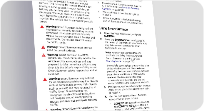 Smart Summon Smart Summon Smart Summon (if equipped) is designed to Before Using Smart Summon allow you to move Model X to your location (using your phone's GPS as a target • Download the latest version of the Tesla destination) or to a location of your choice, mobile app (3.10.0 or later) to your phone, maneuvering around and stopping for objects and ensure your phone has cellular service as necessary. Smart Summon works with the and GPS enabled. Tesla mobile app when your phone is located • Your phone must be connected to within approximately 213 feet (65 meters) of Model X and located within approximately Model X. Using ultrasonic sensors, cameras, 213 feet (65 meters). and GPS data, Smart Summon maneuvers • The vehicle's Autopilot cameras must be Model X out of parking spaces and around fully calibrated (see Drive to Calibrate corners. This is useful for moving Model X out Cameras on page 97). of a tight parking spot, through puddles, or • You must have a clear line of sight to helping you retrieve your car while carrying Model X. packages. You must maintain a clear line of • Model X must be in Park, not charging, sight between you and Model X and closely and all doors and trunks must be closed. monitor the vehicle and its surroundings at all times. Warning: Smart Summon is designed and Using Smart Summon intended for use only on parking lots and 1. Open the Tesla mobile app, and press driveways located on private property SUMMON. where the surrounding area is familiar and 2. Press the Smart Summon icon located in predictable. Do not use Smart Summon the center of the image of your Model X. It on public roads. may take several seconds for Smart Warning: Smart Summon must only be Summon to start up. used on paved surfaces. Note: You can use Standby Mode to Warning: Smart Summon is a BETA eliminate the delay that occurs when feature. You must continually monitor the Smart Summon is starting up (see vehicle and its surroundings and stay Standby Mode on page 119). prepared to take immediate action at any The mobile app displays a map with a blue time. It is the driver's responsibility to use circle, which represents the maximum Smart Summon safely, responsibly, and as proximity that you must maintain between intended. your phone and Model X (213 feet/65 Warning: Smart Summon may not stop meters). The blue dot on the map for all objects (especially very low objects represents your location, and the red such as some curbs, or very high objects arrow represents the location of Model X. such as a shelf) and may not react to all 3. Position yourself anywhere within the blue traffic. Smart Summon does not circle where you have a clear line of sight recognize the direction of traffic, does to Model X. not navigate around empty parking 4. You can now operate Smart Summon spaces, and may not anticipate crossing using either of these modes: traffic. • COME TO ME mode: Press and hold Warning: Smart Summon's performance the COME TO ME button. Model X depends on the ultrasonic sensors, the moves to your GPS location. As you visibility of the cameras, and the move, Model X follows you. When availability of an adequate cellular signal Model X reaches you, it stops and and GPS data. shifts into park. Warning: When using Smart Summon, you must maintain a clear line of sight between you and Model X and stay prepared to stop the vehicle at any time by releasing the button on the mobile app. 118 Model X Owner's Manual