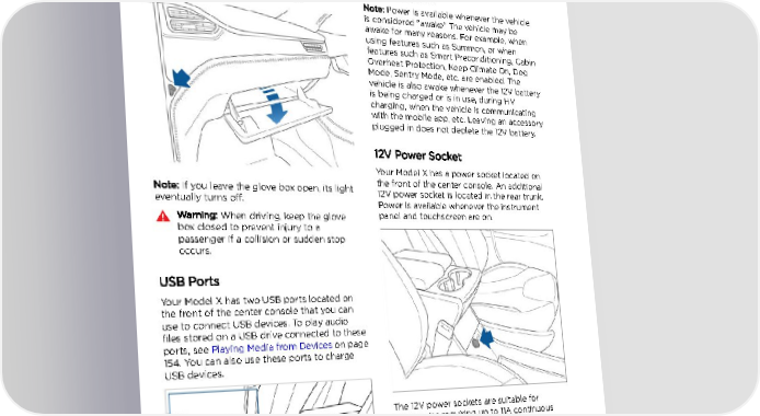 Interior Storage and Electronics Interior Storage and Electronics Glove Box In addition, Model X has two charge-only USB ports located at the rear of the center console, To open the glove box, press the switch and another charge-only connection located located on the side of the touchscreen. The between the third row seats. glove box locks whenever Model X is locked Note: You can charge four devices externally, using the key or walk-away locking. simultaneously using the two ports at the It also locks when Model X is in Valet mode front of the center console and the two at the (see Valet Mode on page 47). It does not rear of the console. lock when you lock Model X using the lock icon on the touchscreen's status bar. Note: Power is available whenever the vehicle is considered "awake" The vehicle may be awake for many reasons. For example, when using features such as Summon, or when features such as Smart Preconditioning, Cabin Overheat Protection, Keep Climate On, Dog Mode, Sentry Mode, etc. are enabled. The vehicle is also awake whenever the 12V battery is being charged or is in use, during HV charging, when the vehicle is communicating with the mobile app, etc. Leaving an accessory plugged in does not deplete the 12V battery. 12V Power Socket Your Model X has a power socket located on Note: If you leave the glove box open, its light the front of the center console. An additional eventually turns off. 12V power socket is located in the rear trunk. Power is available whenever the instrument Warning: When driving, keep the glove panel and touchscreen are on. box closed to prevent injury to a passenger if a collision or sudden stop occurs. USB Ports Your Model X has two USB ports located on the front of the center console that you can use to connect USB devices. To play audio files stored on a USB drive connected to these ports, see Playing Media from Devices on page 154. You can also use these ports to charge USB devices. The 12V power sockets are suitable for accessories requiring up to 11A continuous draw (15A peak) or a maximum of 150 continuous watts (180 watts peak). Note: Power is available whenever the vehicle is considered "awake" The vehicle may be awake for many reasons. For example, when using features such as Summon, or when features such as Smart Preconditioning, Cabin Overheat Protection, Keep Climate On, Dog Mode, Sentry Mode, etc. are enabled. The vehicle is also awake whenever the 12V battery is being charged or is in use, during HV charging, when the vehicle is communicating 20 Model X Owner's Manual