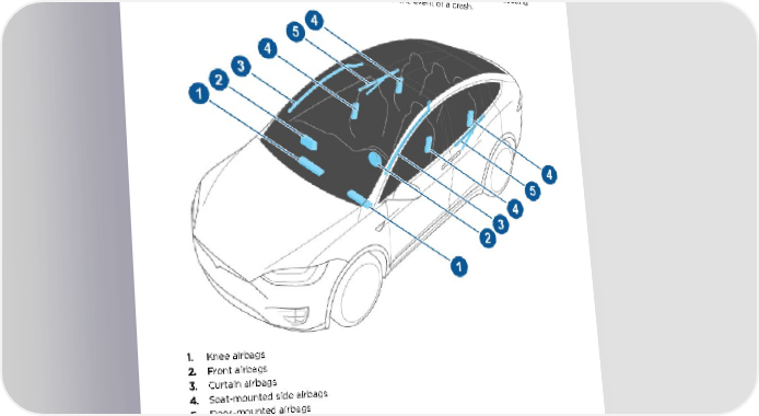 Airbags Airbags Location of Airbags Airbags are located in the approximate areas shown below. Airbag warning information is printed on the sun visors. Model X is equipped with an airbag and lap/shoulder belt at both front seating positions. The airbag is a supplemental restraint at those seating positions. All occupants, including the driver, should always wear their seat belts whether or not an airbag is also provided at their seating position to minimize the risk of severe injury or death in the event of a crash. 1. Knee airbags 2. Front airbags 3. Curtain airbags 4. Seat-mounted side airbags 5. Door-mounted airbags Seating and Safety Restraints 41