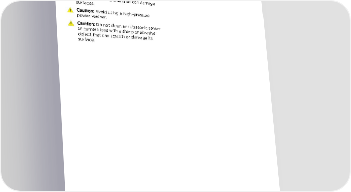 About Autopilot Cleaning Cameras and Sensors To ensure the various Autopilot components can provide information that is as accurate as possible, keep them clean and free of obstructions or damage. Occasionally remove any buildup of dirt by wiping the components with a soft cloth dampened with warm water. Caution: Do not use chemical-based or abrasive cleaners. Doing so can damage surfaces. Caution: Avoid using a high-pressure power washer. Caution: Do not clean an ultrasonic sensor or camera lens with a sharp or abrasive object that can scratch or damage its surface. 98 Model X Owner's Manual