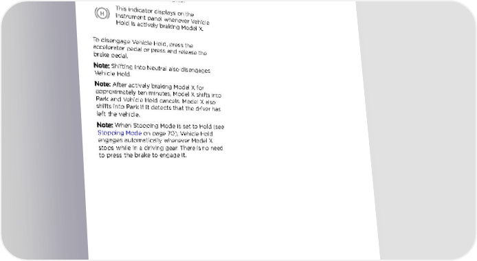 Vehicle Hold Vehicle Hold When Model X is stopped, Vehicle Hold can continue to apply the brakes even after you remove your foot from the brake pedal. When driving on a hill or on a flat surface, brake as you normally would. After coming to a complete stop, simply press the brake pedal again (until the instrument panel displays the Vehicle Hold indicator light) to enable Vehicle Hold. You can then release the brake pedal and remain stopped, even on a hill. This indicator displays on the instrument panel whenever Vehicle Hold is actively braking Model X. To disengage Vehicle Hold, press the accelerator pedal or press and release the brake pedal. Note: Shifting into Neutral also disengages Vehicle Hold. Note: After actively braking Model X for approximately ten minutes, Model X shifts into Park and Vehicle Hold cancels. Model X also shifts into Park if it detects that the driver has left the vehicle. Note: When Stopping Mode is set to Hold (see Stopping Mode on page 70), Vehicle Hold engages automatically whenever Model X stops while in a driving gear. There is no need to press the brake to engage it. 76 Model X Owner's Manual