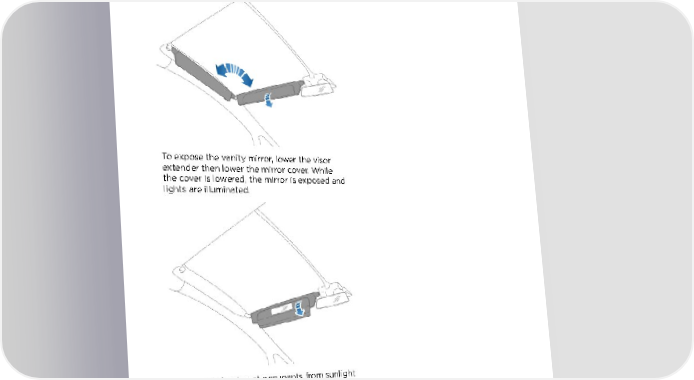 Sun Visors Sun Visors The sun visors in Model X are held in place by magnets. To protect occupants from sunlight coming through the windshield, release the sun visor from the pillar and pivot it toward the rear view mirror until the magnet snaps into place. While held in place by the magnet, you can adjust the sun visor and lower the extender to provide maximum shade. To expose the vanity mirror, lower the visor extender then lower the mirror cover. While the cover is lowered, the mirror is exposed and lights are illuminated. To protect front seat occupants from sunlight coming through the side window, lower the sun visor from the pillar then lower the visor extender. Opening and Closing 23