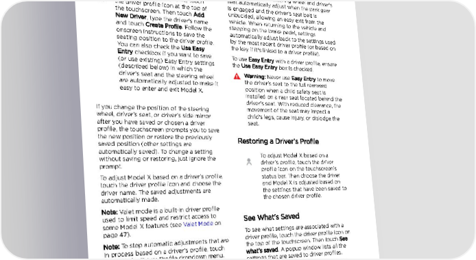 Driver Profiles Driving Driver Profiles Creating a Driver Profile Easy Entry When you first adjust the driver‡s seat, You can define an Easy Entry setting that steering wheel, or driver‡s side mirror, the moves the steering wheel and driver's seat to touchscreen prompts you to create a driver make it easy to enter and exit Model X. Any profile to save these adjustments. Your profile driver can use the Easy Entry setting by also saves some of the preferences you make associating it with their driver's profile. When using the touchscreen's Controls window. the Easy Entry setting is associated with a driver's profile, the steering wheel and driver's To add a new driver profile, touch seat automatically adjust when the park gear the driver profile icon at the top of is engaged and the driver's seat belt is the touchscreen. Then touch Add unbuckled, allowing an easy exit from the New Driver, type the driver's name vehicle. When returning to the vehicle and and touch Create Profile. Follow the stepping on the brake pedal, settings onscreen instructions to save the automatically adjust back to the settings used seating position to the driver profile. by the most recent driver profile (or based on You can also check the Use Easy the key if it's linked to a driver profile). Entry checkbox if you want to save To use Easy Entry with a driver profile, ensure (or use existing) Easy Entry settings the Use Easy Entry box is checked. (described below) in which the Warning: Never use Easy Entry to move driver's seat and the steering wheel the driver's seat to the full rearward are automatically adjusted to make it position when a child safety seat is easy to enter and exit Model X. installed on a rear seat located behind the driver's seat. With reduced clearance, the If you change the position of the steering movement of the seat may impact a wheel, driver‡s seat, or driver‡s side mirror child's legs, cause injury, or dislodge the after you have saved or chosen a driver seat. profile, the touchscreen prompts you to save the new position or restore the previously Restoring a Driver‡s Profile saved position (other settings are automatically saved). To change a setting To adjust Model X based on a without saving or restoring, just ignore the driver‡s profile, touch the driver prompt. profile icon on the touchscreen's To adjust Model X based on a driver‡s profile, status bar. Then choose the driver touch the driver profile icon and choose the and Model X is adjusted based on driver name. The saved adjustments are the settings that have been saved to automatically made. the chosen driver profile. Note: Valet mode is a built-in driver profile used to limit speed and restrict access to See What's Saved some Model X features (see Valet Mode on page 47). To see what settings are associated with a Note: To stop automatic adjustments that are driver profile, touch the driver profile icon on in process based on a driver's profile, touch the top of the touchscreen. Then touch See Stop on the Driver Profile dropdown menu. what‡s saved. A popup window lists all the Automatic adjustments also stop if you settings that are saved to driver profiles. manually adjust a seat, mirror or the steering Note: The settings that are associated with wheel. driver profiles may vary depending on the version of software currently installed on your Model X. 46 Model X Owner's Manual