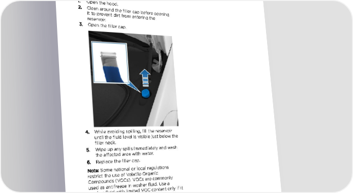Fluid Reservoirs Topping Up Windshield Washer Warning: Windshield washer fluid can Fluid irritate eyes and skin. Read and observe the instructions provided by the washer The only reservoir into which you can add fluid fluid manufacturer. is the windshield washer fluid reservoir, which is located behind the front trunk. When the level is low, a message displays on the instrument panel. To top up the washer fluid: 1. Open the hood. 2. Clean around the filler cap before opening it to prevent dirt from entering the reservoir. 3. Open the filler cap. 4. While avoiding spilling, fill the reservoir until the fluid level is visible just below the filler neck. 5. Wipe up any spills immediately and wash the affected area with water. 6. Replace the filler cap. Note: Some national or local regulations restrict the use of Volatile Organic Compounds (VOCs). VOCs are commonly used as antifreeze in washer fluid. Use a washer fluid with limited VOC content only if it provides adequate freeze resistance for all climates in which you drive Model X. Caution: Do not add formulated washer fluids that contain water repellent or bug wash. These fluids can cause streaking, smearing, and squeaking or other noises. Warning: In temperatures below 40° F (4° C), use a washer fluid with antifreeze. In cold weather, using a washer fluid without antifreeze can impair visibility through the windshield. Maintenance 195
