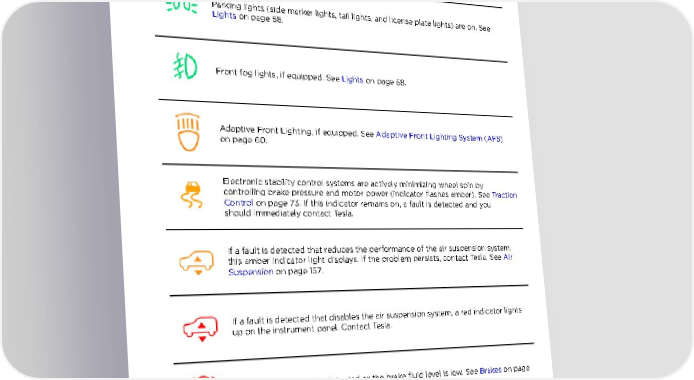Instrument Panel Indicator Description High beam headlights are temporarily turned off because Auto High Beam is on and is detecting light in front of Model X. When light is no longer detected, the high beams automatically turn back on. See High Beam Headlights on page 60. Parking lights (side marker lights, tail lights, and license plate lights) are on. See Lights on page 58. Front fog lights, if equipped. See Lights on page 58. Adaptive Front Lighting, if equipped. See Adaptive Front Lighting System (AFS) on page 60. Electronic stability control systems are actively minimizing wheel spin by controlling brake pressure and motor power (indicator flashes amber). See Traction Control on page 73. If this indicator remains on, a fault is detected and you should immediately contact Tesla. If a fault is detected that reduces the performance of the air suspension system, this amber indicator light displays. If the problem persists, contact Tesla. See Air Suspension on page 157. If a fault is detected that disables the air suspension system, a red indicator lights up on the instrument panel. Contact Tesla. A brake system fault is detected or the brake fluid level is low. See Brakes on page 69. Contact Tesla immediately. Airbag safety. If this red indicator does not flash on briefly when Model X prepares to drive, or if it remains on, contact Tesla immediately. See Airbags on page 41. Driving 63