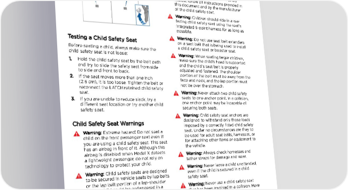 Child Safety Seats developed to avoid injury in a frontal impact. Warning: Do not allow a baby or infant to be held on a lap. All children should be restrained in an appropriate child safety seat at all times. Warning: To ensure children are safely seated, follow all instructions provided in this document and by the manufacturer of the child safety seat. Warning: Children should ride in a rear facing child safety seat using the seat‡s integrated 5-point harness for as long as possible. Testing a Child Safety Seat Warning: Do not use seat belt extenders on a seat belt that is being used to install Before seating a child, always make sure the a child safety seat or booster seat. child safety seat is not loose: Warning: When seating larger children, 1. Hold the child safety seat by the belt path make sure the child's head is supported and try to slide the safety seat from side and the child‡s seat belt is properly to side and front to back. adjusted and fastened. The shoulder 2. If the seat moves more than one inch portion of the belt must be away from the (2.5 cm), it is too loose. Tighten the belt or face and neck, and the lap portion must reconnect the LATCH retained child safety not be over the stomach. seat. Warning: Never attach two child safety 3. If you are unable to reduce slack, try a seats to one anchor point. In a collision, different seat location or try another child one anchor point may be incapable of safety seat. securing both seats. Warning: Child safety seat anchors are Child Safety Seat Warnings designed to withstand only those loads imposed by a correctly fitted child safety Warning: Extreme hazard! Do not seat a seat. Under no circumstances are they to child on the front passenger seat even if be used for adult seat belts, harnesses, or you are using a child safety seat. This seat for attaching other items or equipment to has an airbag in front of it. Although this the vehicle. airbag is disabled when Model X detects Warning: Always check harnesses and a lightweight passenger, do not rely on tether straps for damage and wear. technology to protect your child. Warning: Child safety seats are designed Warning: Never leave a child unattended, to be secured in vehicle seats by lap belts even if the child is secured in a child or the lap belt portion of a lap-shoulder safety seat. belt. A child could be endangered in a Warning: Never use a child safety seat crash if a child safety seat is not properly that has been involved in a collision. Have secured in the vehicle. the seat inspected or replaced as Warning: According to collision statistics, described in the child safety seat children are safer when properly manufacturer‡s instructions. restrained in the rear seating positions than in the front seating positions. Warning: Do not use a forward facing child safety seat until your child weighs over 20 lbs (9 kg) and can sit independently. Up to the age of two, a child's spine and neck are not sufficiently 40 Model X Owner's Manual