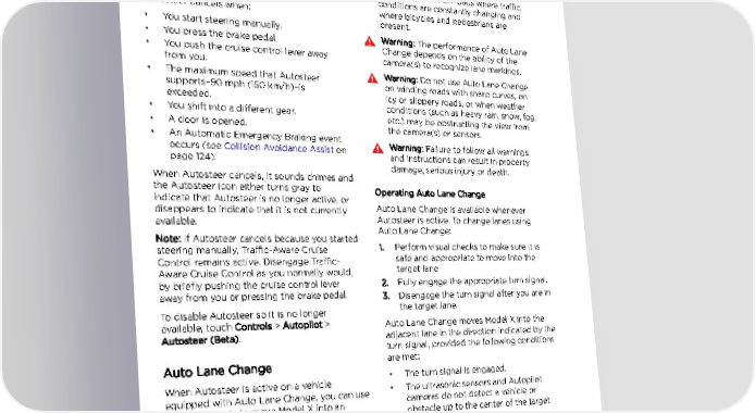 Autosteer driving path. Drive attentively by watching the road and traffic ahead of you, checking the surrounding area, and monitoring the instrument panel for warnings. Always be prepared to take When you see this message, TAKE OVER immediate action. STEERING IMMEDIATELY. Warning: Do not use Auto Lane Change on city streets or on roads where traffic Canceling Autosteer conditions are constantly changing and Autosteer cancels when: where bicycles and pedestrians are present. • You start steering manually. Warning: The performance of Auto Lane • You press the brake pedal. Change depends on the ability of the • You push the cruise control lever away camera(s) to recognize lane markings. from you. • The maximum speed that Autosteer Warning: Do not use Auto Lane Change supports–90 mph (150 km/h)–is on winding roads with sharp curves, on exceeded. icy or slippery roads, or when weather • You shift into a different gear. conditions (such as heavy rain, snow, fog, • A door is opened. etc.) may be obstructing the view from the camera(s) or sensors. • An Automatic Emergency Braking event Warning: Failure to follow all warnings occurs (see Collision Avoidance Assist on and instructions can result in property page 124). damage, serious injury or death. When Autosteer cancels, it sounds chimes and the Autosteer icon either turns gray to Operating Auto Lane Change indicate that Autosteer is no longer active, or Auto Lane Change is available whenever disappears to indicate that it is not currently Autosteer is active. To change lanes using available. Auto Lane Change: Note: If Autosteer cancels because you started 1. Perform visual checks to make sure it is steering manually, Traffic-Aware Cruise safe and appropriate to move into the Control remains active. Disengage Traffic- target lane Aware Cruise Control as you normally would, by briefly pushing the cruise control lever 2. Fully engage the appropriate turn signal. away from you or pressing the brake pedal. 3. Disengage the turn signal after you are in To disable Autosteer so it is no longer the target lane. available, touch Controls > Autopilot > Auto Lane Change moves Model X into the Autosteer (Beta). adjacent lane in the direction indicated by the turn signal, provided the following conditions Auto Lane Change are met: When Autosteer is active on a vehicle • The turn signal is engaged. equipped with Auto Lane Change, you can use • The ultrasonic sensors and Autopilot the turn signals to move Model X into an cameras do not detect a vehicle or adjacent lane without moving the steering obstacle up to the center of the target wheel (which would cancel Autosteer). lane. Warning: It is the driver's responsibility to • The lane markings indicate that a lane determine whether a lane change is safe change is permitted. and appropriate. Therefore, before • The view of the camera(s) is not initiating a lane change, always check obstructed. blind spots, lane markings, and the • Your vehicle does not detect another surrounding roadway to confirm it is safe vehicle in its blind spot. and appropriate to move into the target • Midway through the lane change, Auto lane. Lane Change can detect the outside lane Warning: Never depend on Auto Lane marking of the target lane. Change to determine an appropriate • Driving speed is at least 30 mph (45 km/h). 108 Model X Owner's Manual
