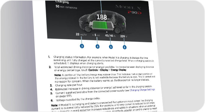 Charging Instructions Charging Status The following illustration is provided for demonstration purposes only and may vary slightly depending on the software version and market region. 1. Charging status information. For example, when Model X is charging, it displays the time remaining until fully charged at the currently selected charge level. When a charging session is scheduled, it displays when charging starts. 2. Total estimated driving distance (or energy) available. To choose between displaying distance or energy percentage, touch Controls > Display > Energy Display. Note: A portion of the battery image may appear blue. This indicates that a small portion of the energy stored in the battery is not available because the battery is cold. This is normal and no reason for concern. When the battery warms up, the blue portion no longer displays. 3. Charging rate per hour. 4. Estimated increase in driving distance (or energy) achieved so far in this charging session. 5. Current supplied/available from the connected power supply (see Changing Charge Settings on page 177). 6. Voltage supplied by the charge cable. Note: If Model X is charging and detects unexpected fluctuations in input power, the charging current is automatically reduced by 25%. For example, a 40 amp current is reduced to 30 amps. This automatic current reduction increases robustness and safety in situations when an external problem exists (for example, a home wiring system, receptacle, adapter or cord is unable to meet its rated current capacity). As a precaution, when Model X automatically reduces current, it saves the reduced current at the charging location. Although you can manually increase it, Tesla recommends charging at the lower current until the underlying problem is resolved and the charging location can provide consistent power. Charging 179