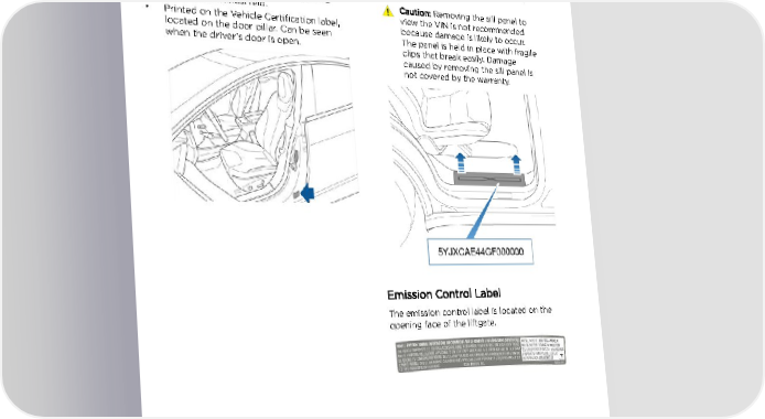 Identification Labels Specifications Identification Labels Vehicle Identification Number • Stamped on the chassis under the sill panel on the rear passenger door. To You can find the VIN at the following remove the sill panel, gently pry it upward locations: using a flat-bladed tool. • Touch the Tesla "T" at the top center of Note: The VIN was not stamped on the the touchscreen. The popup window chassis on vehicles manufactured between displays the VIN. approximately June 2, 2016 and Feb 28, • Stamped on a plate located at the top of 2017. the dashboard. Can be seen by looking Caution: Removing the sill panel to through the windshield. view the VIN is not recommended • Printed on the Vehicle Certification label, because damage is likely to occur. located on the door pillar. Can be seen The panel is held in place with fragile when the driver‡s door is open. clips that break easily. Damage caused by removing the sill panel is not covered by the warranty. Emission Control Label The emission control label is located on the opening face of the liftgate. 198 Model X Owner's Manual