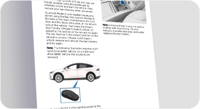 Keys and Doors Unlocking When the Key Doesn't Work If Model X does not unlock when you walk up to it, or when you double-click the unlock button on the top of your key, the key‡s battery may be dead. Even if this is the case, you can still use the key to unlock and drive Model X. Note: Although you can still use your key, you should consider using the mobile app to remotely unlock and start the vehicle. Then, replace your key's battery when convenient. To unlock Model X (and disable the security alarm) using the key, first position the key at the base of the door pillar between the front door and the falcon wing door, on the driver's Note: Unlocking Model X using this method side of the vehicle. Then press the driver's disables walk away locking. You must door handle. If Model X doesn't unlock, try manually re-enable walk away locking after adjusting the position of the key and try again. replacing the key‡s battery. The key must be in the correct position for the vehicle to unlock. If Model X still doesn't unlock, remove and reinstall the key's battery and try again. Note: The following illustration assumes a left hand drive (LHD) vehicle. On a right hand drive (RHD) vehicle, the locations are mirrored. To drive Model X after gaining access to the cabin, place the bottom of the key against the center console, immediately below the 12V power outlet, then press and hold the brake pedal to start Model X. Opening and Closing 13