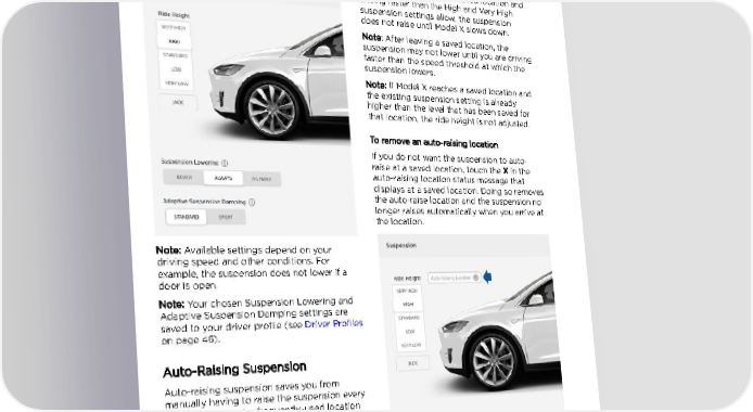 Air Suspension ADAPTIVE SUSPENSION DAMPING: Choose from STANDARD or SPORT to adjust the feel of the suspension system. STANDARD provides a softer and more fluid ride whereas SPORT provides a firmer, more controlled ride that increases driver engagement and connection to the road. Note: When returning to a saved location and driving faster than the High and Very High suspension settings allow, the suspension does not raise until Model X slows down. Note: After leaving a saved location, the suspension may not lower until you are driving faster than the speed threshold at which the suspension lowers. Note: If Model X reaches a saved location and the existing suspension setting is already higher than the level that has been saved for that location, the ride height is not adjusted. To remove an auto-raising location If you do not want the suspension to auto- raise at a saved location, touch the X in the auto-raising location status message that displays at a saved location. Doing so removes the auto-raise location and the suspension no longer raises automatically when you arrive at the location. Note: Available settings depend on your driving speed and other conditions. For example, the suspension does not lower if a door is open. Note: Your chosen Suspension Lowering and Adaptive Suspension Damping settings are saved to your driver profile (see Driver Profiles on page 46). Auto-Raising Suspension Auto-raising suspension saves you from manually having to raise the suspension every time you arrive at a frequently-used location where you have previously raised the suspension. Whenever you raise the suspension to HIGH or VERY HIGH, Model X saves the location. When you return to the saved location, Model X raises the suspension and the instrument panel displays this message: Note: Manually lowering the suspension to STANDARD, LOW, or VERY LOW while at a saved location also removes the auto-raising location. 158 Model X Owner's Manual