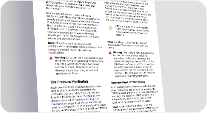 Tire Care and Maintenance Wheel Configuration As an added safety feature, your vehicle has If you are installing new wheels or swapping been equipped with a TPMS that displays a them for different ones, update your vehicle's tire pressure telltale (Tire Pressure Warning) wheel configuration by touching Controls > on the instrument panel when one or more of Service > Wheel Configuration. This allows your tires is significantly under- or over- Model X to learn the new wheels and provide inflated. Accordingly, when the Tire Pressure more accurate status updates on your vehicle. indicator light displays on the instrument Select a wheel from the drop down menu that panel to alert you about tire pressure, stop matches the new wheels you plan to install on and check your tires as soon as possible, and Model X. Selecting new wheels in the wheel inflate them to the proper pressure (see configuration also changes the wheels that Maintaining Tire Pressures on page 183). appear on your vehicle's avatar on the Driving on a significantly under-inflated tire touchscreen. causes the tire to overheat and can lead to tire failure. Under-inflation also reduces range Ensure you are aware if your vehicle is efficiency and tire tread life, and may affect equipped with staggered wheels, meaning the the vehicle's handling and stopping ability. wheels are different sizes in the front and rear. Check the front and rear tire sizes marked on If Model X detects a fault with the the tire sidewall to see if they match or are TPMS, this indicator flashes for one different sizes. If the wheels are staggered, minute whenever you power on take extra precaution to ensure the new Model X. wheels you install are staggered in the same way as the previous wheels. Note: Installing accessories that are not Note: Changing your vehicle's wheel approved by Tesla can interfere with the configuration can impact range estimates, tire TPMS. pressure warning levels, and vehicle Warning: The TPMS is not a substitute for visualization. proper tire maintenance, including Warning: Only use Tesla-approved wheels manually checking tire pressures and when installing or swapping wheels. Using regularly inspecting the condition of tires. non Tesla-approved wheels can cause It is the driver's responsibility to maintain serious damage. Tesla is not liable for correct tire pressure, even if under- or damage caused by using wheels not over-inflation has not reached the level approved by Tesla. for the TPMS to trigger the Tire Pressure Warning on the instrument panel. Tire Pressure Monitoring Automatic Reset of TPMS Sensors Each tire should be checked monthly when After replacing one or more wheels (but not cold and inflated to the recommended after replacing a tire or rotating wheels), the pressures that are printed on the Tire and TPMS sensors are reset to ensure tire pressure Loading Information label located on the warnings are accurate. TPMS sensors reset driver‡s door pillar (see Maintaining Tire automatically after driving over 15 mph Pressures on page 183). If your vehicle has (25 km/h) for longer than 10 minutes. tires of a different size than the size indicated on the vehicle placard or tire inflation pressure Note: After replacing a wheel, false tire label, determine the proper tire inflation pressure warnings may display before you've pressure for those tires. driven 15 mph (25 km/h) for longer than 10 minutes. Replacing a Tire Sensor If the Tire Pressure warning indicator displays frequently, contact Tesla to determine if a tire sensor needs to be replaced. If a non-Tesla Service Center repairs or replaces a tire, the tire sensor may not work until Tesla performs the setup procedure. Maintenance 187