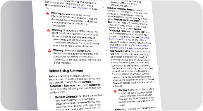 Summon Summon Summon (if equipped) allows you to • Side Clearance: Choose an option to automatically park and retrieve Model X while specify how much side clearance you you are standing outside the vehicle. Summon want to allow. Tight allows Model X to uses data from the ultrasonic sensors to move enter and exit very narrow parking spaces. Model X forward and reverse up to 39 feet (12 Warning: Parking in a narrow space meters) in, or out of, a parking space. limits the ability of the sensors to To move Model X a distance of up to 475 feet accurately detect the location of (145 meters) while steering around objects, obstacles, increasing the risk of you can use Smart Summon and your mobile damage to Model X and/or phone. Smart Summon allows your vehicle to surrounding objects. find you (or you can send your vehicle to a • Require Continuous Press: By default, chosen location). See Smart Summon on page Summon requires that you press and hold 118. a button on the mobile app or key to Warning: Summon is designed and move Model X during the parking process. intended for use only on parking lots and When Require Continuous Press is set to driveways on private property where the NO, you can press and release the button surrounding area is familiar and —you don't need to hold it down to keep predictable. the vehicle moving. Also, Require Continuous Press must be set to NO if you Warning: Summon is a BETA feature. You want to operate Summon using the key must continually monitor the vehicle and instead of the mobile app (see Operating its surroundings and stay prepared to Summon with the Key on page 116), or if take immediate action at any time. It is you want to start a parking sequence from the driver's responsibility to use Summon inside the vehicle (see Starting Summon safely, responsibly, and as intended. Before Exiting the Vehicle on page 117). Warning: Summon's performance • Use Auto HomeLink (if equipped): Set to depends on the ability of the ultrasonic ON if you want to activate HomeLink to sensors to determine the vehicle's open/close a programmed HomeLink proximity to objects, people, animals, and device (such as a gate or a garage door) other vehicles. during the parking process when using Summon or Smart Summon. If enabled, Before Using Summon the device automatically opens and closes when Model X enters or exits during a Before operating Summon, use the Summon session. In an Smart Summon touchscreen to enable it and customize how session, the device automatically opens you want it to work. Touch Controls > when, at the beginning of a session, Smart Autopilot > Summon, then touch Customize Summon detects that Model X is parked in and adjust the following settings to suit your a garage. preferences: Warning: Always ensure that Model X • Bumper Clearance: Set the distance that is fully in or out of a garage before you want Summon to stop from a HomeLink lowers the garage door. detected object (for example, you may Summon and Smart Summon cannot want Summon to stop within just a few detect where an overhead door will inches of a garage wall). Note that this lower. distance applies only to objects that Note: When enabled, the HomeLink device Summon detects directly in front of automatically opens and closes when Model X when moving forward, or directly using Summon, and automatically opens behind Model X when reversing. as needed when using Smart Summon. To • Summon Distance: Set a maximum automate HomeLink in other situations distance that Model X can travel when (such as normal driving), you must adjust entering or exiting a parking space. the HomeLink device's main settings by touching the HomeLink icon at the top of the touchscreen (see HomeLink Universal Transceiver on page 164). Note: The above settings, with the exception of HomeLink, apply only to Summon—not Smart Summon (see Before Using Smart Autopilot 115