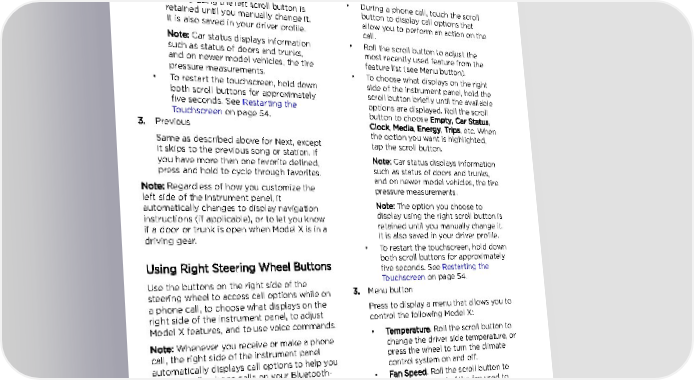 Steering Wheel • To choose what displays on the left 1. Press to use a voice command to call a side of the instrument panel, hold the contact, navigate, or listen to Internet scroll button briefly until the available music. When you hear the tone, speak options are displayed. Roll the scroll your command. Press again to end the button to choose Empty, Car Status, voice command, or simply stop speaking. Clock, Media, Energy, Trips, etc. When For details, see Using Voice Commands on the option you want is highlighted, page 51. tap the scroll button. 2. Scroll Button Note: The option you choose to • During a phone call, touch the scroll display using the left scroll button is button to display call options that retained until you manually change it. allow you to perform an action on the It is also saved in your driver profile. call. Note: Car status displays information • Roll the scroll button to adjust the such as status of doors and trunks, most recently used feature from the and on newer model vehicles, the tire feature list (see Menu button). pressure measurements. • To choose what displays on the right • To restart the touchscreen, hold down side of the instrument panel, hold the both scroll buttons for approximately scroll button briefly until the available five seconds. See Restarting the options are displayed. Roll the scroll Touchscreen on page 54. button to choose Empty, Car Status, 3. Previous Clock, Media, Energy, Trips, etc. When the option you want is highlighted, Same as described above for Next, except tap the scroll button. it skips to the previous song or station. If Note: Car status displays information you have more than one favorite defined, such as status of doors and trunks, press and hold to cycle through favorites. and on newer model vehicles, the tire Note: Regardless of how you customize the pressure measurements. left side of the instrument panel, it Note: The option you choose to automatically changes to display navigation display using the right scroll button is instructions (if applicable), or to let you know retained until you manually change it. if a door or trunk is open when Model X is in a It is also saved in your driver profile. driving gear. • To restart the touchscreen, hold down Using Right Steering Wheel Buttons both scroll buttons for approximately five seconds. See Restarting the Use the buttons on the right side of the Touchscreen on page 54. steering wheel to access call options while on 3. Menu button a phone call, to choose what displays on the Press to display a menu that allows you to right side of the instrument panel, to adjust control the following Model X: Model X features, and to use voice commands. Note: Whenever you receive or make a phone • Temperature. Roll the scroll button to call, the right side of the instrument panel change the driver side temperature, or automatically displays call options to help you press the wheel to turn the climate easily handle phone calls on your Bluetooth- control system on and off. connected phone. • Fan Speed. Roll the scroll button to adjust the speed of the fan used to cool or heat the cabin. • Display Brightness. Roll the scroll button to change the brightness level of the displays, or press the wheel to restore default settings. • Recent Calls. If your phone is paired to Model X, roll the scroll button to view your recent calls. Press the scroll button to call the contact that's displayed. To pair your phone, see Pairing a Bluetooth Phone on page 155. 50 Model X Owner's Manual