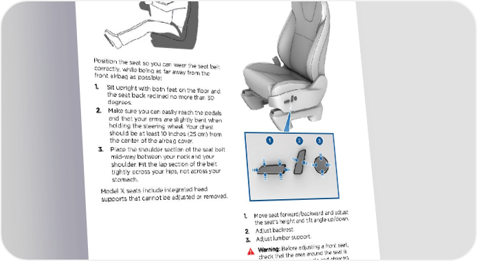 Front and Rear Seats Seating and Safety Restraints Front and Rear Seats Correct Driving Position Adjusting the Front Seats The seat, head support, seat belt and airbags work together to maximize your safety. Using these correctly ensures greater protection. Position the seat so you can wear the seat belt correctly, while being as far away from the front airbag as possible: 1. Sit upright with both feet on the floor and the seat back reclined no more than 30 degrees. 2. Make sure you can easily reach the pedals and that your arms are slightly bent when holding the steering wheel. Your chest should be at least 10 inches (25 cm) from the center of the airbag cover. 3. Place the shoulder section of the seat belt mid-way between your neck and your shoulder. Fit the lap section of the belt tightly across your hips, not across your stomach. Model X seats include integrated head supports that cannot be adjusted or removed. 1. Move seat forward/backward and adjust the seat‡s height and tilt angle up/down. 2. Adjust backrest. 3. Adjust lumbar support. Warning: Before adjusting a front seat, check that the area around the seat is free of obstacles (people and objects). Warning: Do not adjust seats while driving. Doing so increases the risk of a collision. Warning: Riding in a moving vehicle with the seat back reclined can result in serious injuries in a collision, as you could slide under the lap belt or be propelled into the seat belt. Ensure your seat back is reclined no more than 30 degrees when the vehicle is moving. 24 Model X Owner's Manual